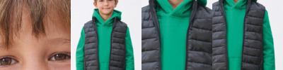 Recycled polyester outer. Recycled polyester lining. Polyester down padding. Showerproof. Lightweight. Collar high full length nylon zip. Metal zip pull with taffeta zip pullers. Two front zip pockets. Elasticated bound armholes and hem. Tag free. Packs into unbranded storage bag.