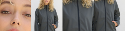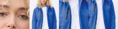Two layer soft shell. Recycled polyester. Recycled polyester polar fleece lining. Showerproof. Grown on hood with adjustable drawcord. Full length nylon zip with inner zip guard. Two front zip pockets. Open cuffs and hem. Drop hem. Tear out label. Access for decoration.