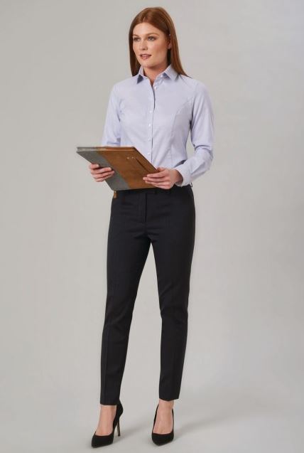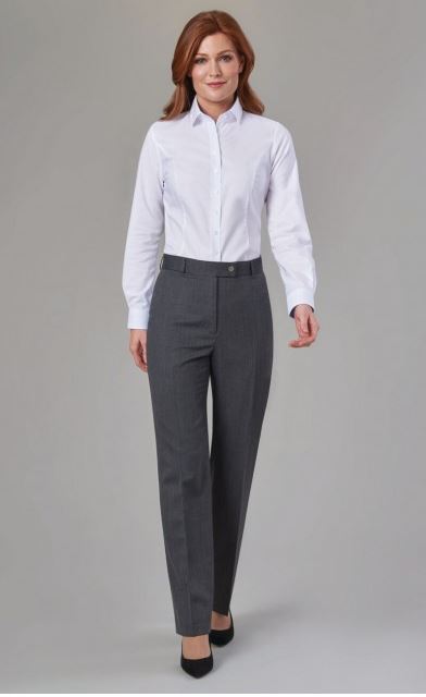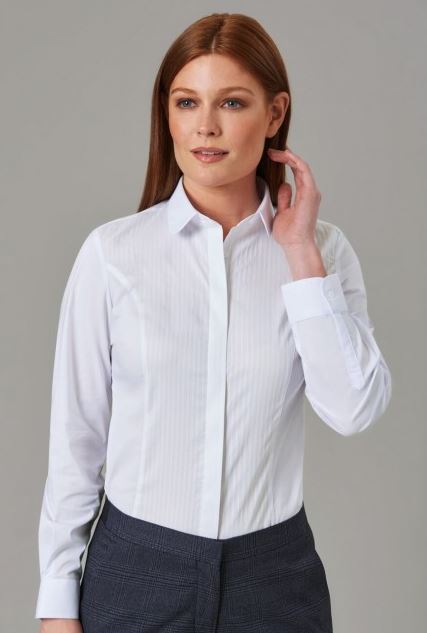 100% Polyester with mechanical stretch. Long sleeve ladies' blouse, with fly front & button detail, central back pleat, metallic button cuff easy care - machine washable at 30°