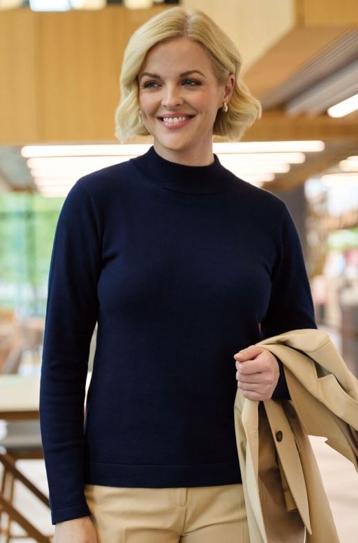 60% Cotton, 40% Acrylic 12 gauge knit Turtleneck jumper, ribbed neck, cuff and hem, contrast inner neck strip.