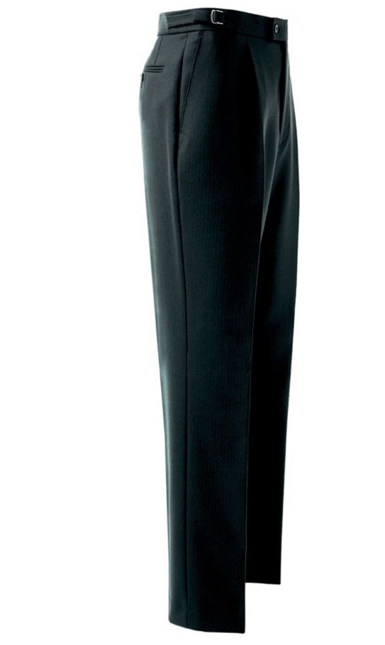 100% pure new wool Single pleat, buckle side adjuster Single pleat trouser, slant side pockets, one hip pocket, side buckle adjusters, classic fit