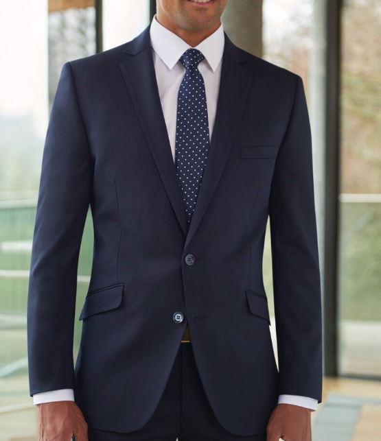64% Polyester (Recycled), 34% Wool, 2% LYCRA® Elastane. Slim fit, single breasted, 2 button jacket, side vents, slim lapels with saddle stitching, piano faced interior with slim pocket jets. Centre back length at size 40R = 75cm