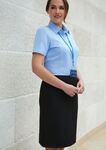 94% Polyester, 6% Elastane. Short sleeve ladies' blouse, with fly front & button detail, central back pleat, easy care - machine washable at 30 degrees