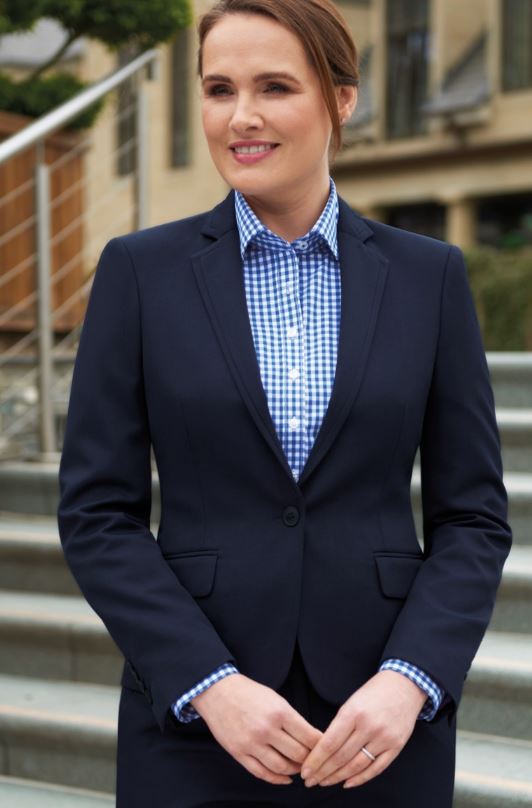 64% Polyester (Recycled), 34% Wool, 2% LYCRA® Elastane. Short, slim fit, 1 button jacket, peaked lapel, 2 flap and 2 jetted pockets, plain back, tailored back panels, 1 inside pocket. Centre back length at size 12R = 55.5cm