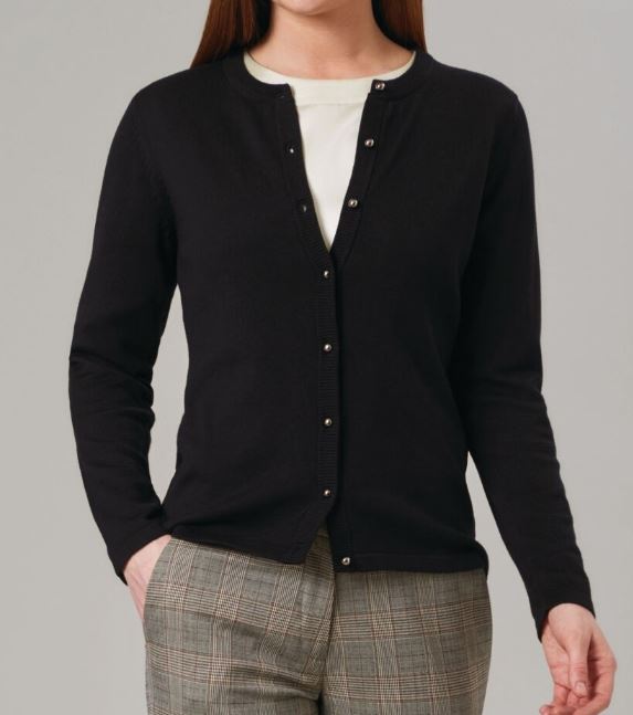 50% Merino Wool, 50% Cotton. V-neck cardigan, ribbed placket, cuff and hem, double contrast inner neck design detail.