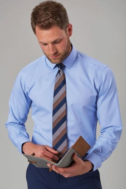 100% Non-Iron Cotton Twill. Semi-fitted, long sleeve, single cuff, point collar