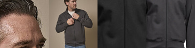 Three-thread fabric. Brushed inside. Ribs with elastane. Double dyed. Double pre-shrunk. Two front pockets with zips. SBS zips.