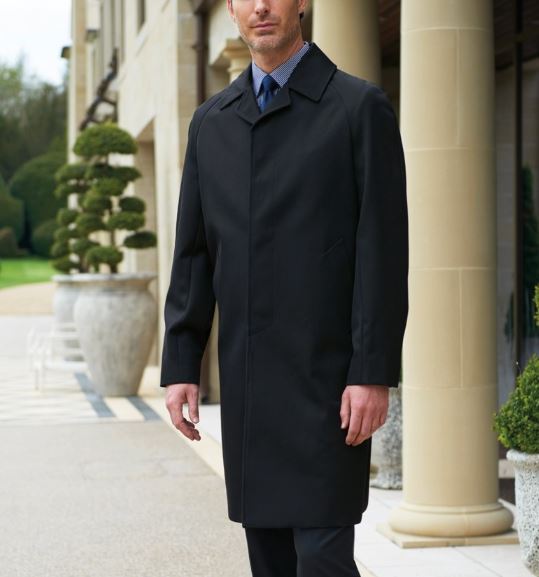 100% Waterproof Polyester. 5 button fly front with zip, showerproof, centre vent, 2 outer welt pockets, quilted lining with 2 internal pockets, collar incorporating concealed hood, cuff with tab detail, front princess seams. centre back length @ 12R = 93cm.