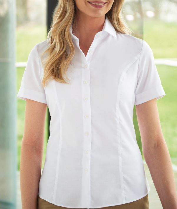 100% Polyester with mechanical stretch. Short sleeve ladies' blouse, with fly front & button detail, central back pleat, easy care - machine washable at 30°